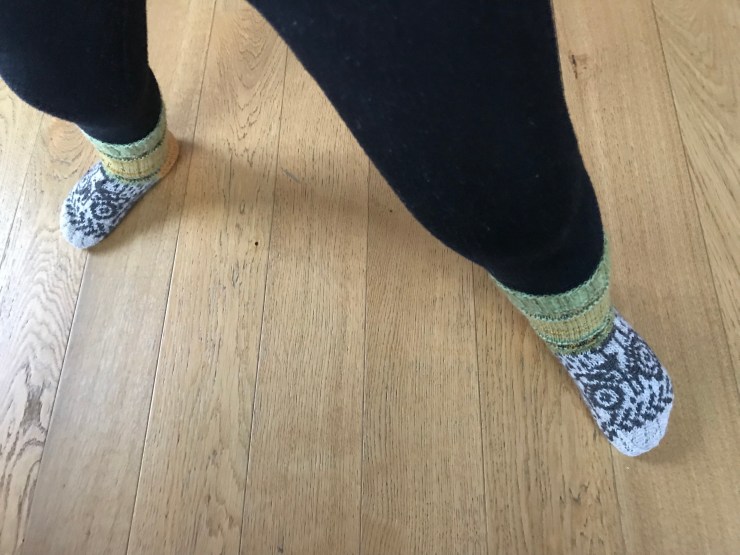 Så fina! De här sista med elefanter var till John, men hälen var konstig så mamma valde att göra nya med pandor där hon hade vanlig häl i stället. Andra sockor hon stickade med den konstiga spetsiga hälmodellen ändrade hon till den rundade. Då sitter strumpan på bättre.