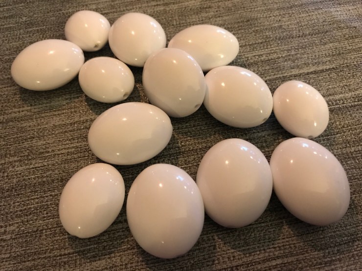 För länge sen köpte jag ett vitt halsband med stora vita pärlor. Jag har klippt sönder det för att göra något nytt av pärlorna. Nu upptäckte jag att de nästan såg ut som ägg.