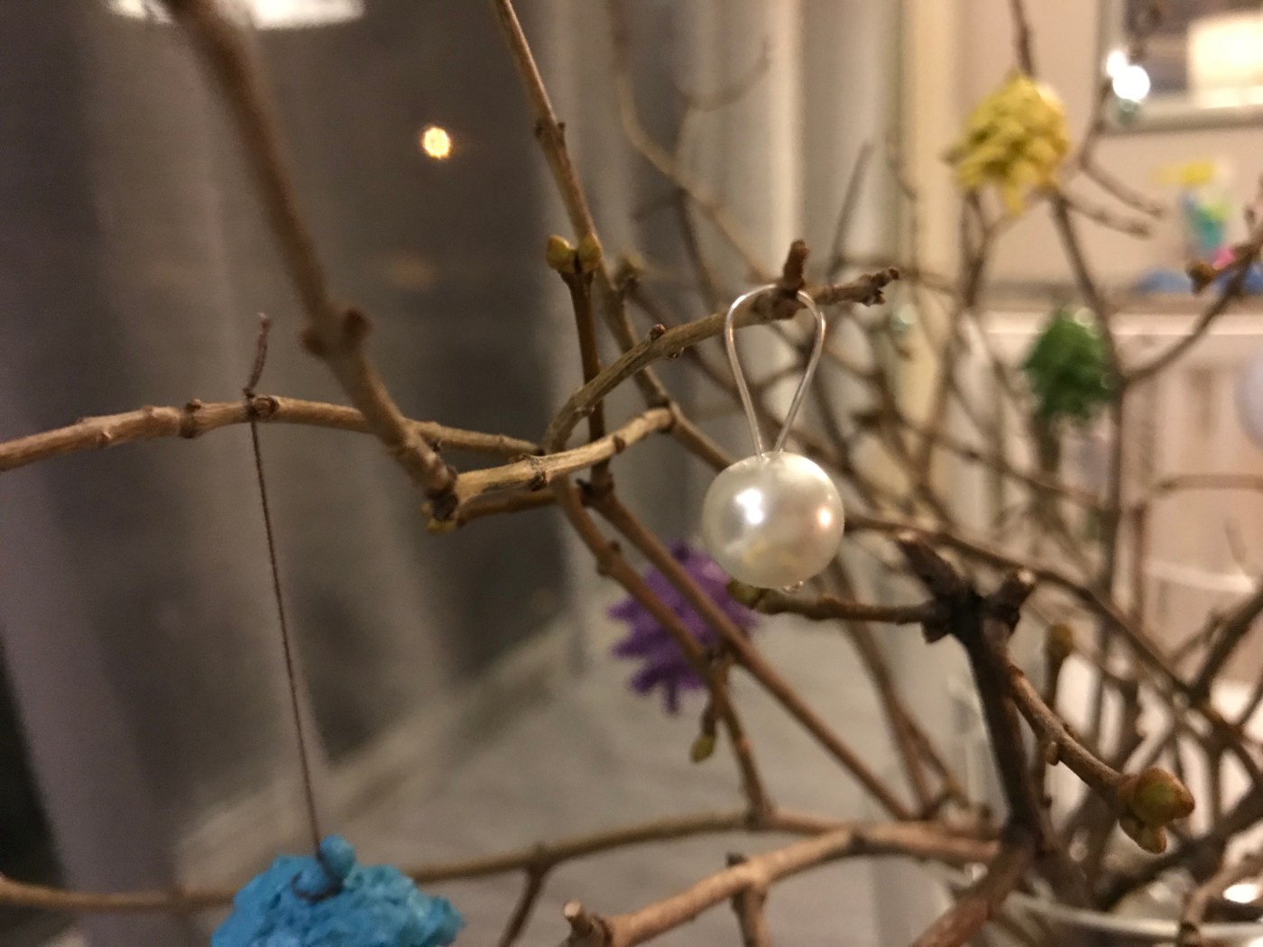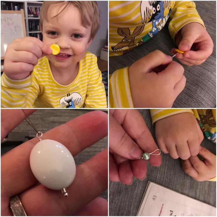 Min son hittade fler pärlor att hänga upp och hjälpte till.
