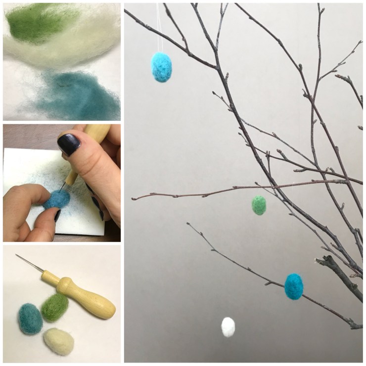 Jag bestämde mig för att göra några små ull-ägg till påskriset. Det går hur snabbt som helst att göra ett litet ägg – men man får passa fingrarna så att man inte sticker sig!