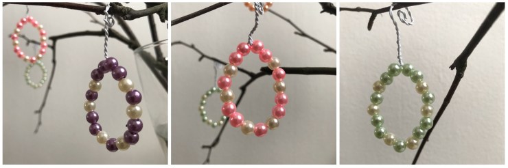 Jag funderade på vad som skulle kunna vara ett enkelt påskpyssel att göra med barn – det här blev resultatet. Det som behövs är pärlor och ståltråd som man böjer till en äggform, klart på ett par minuter! 🙂