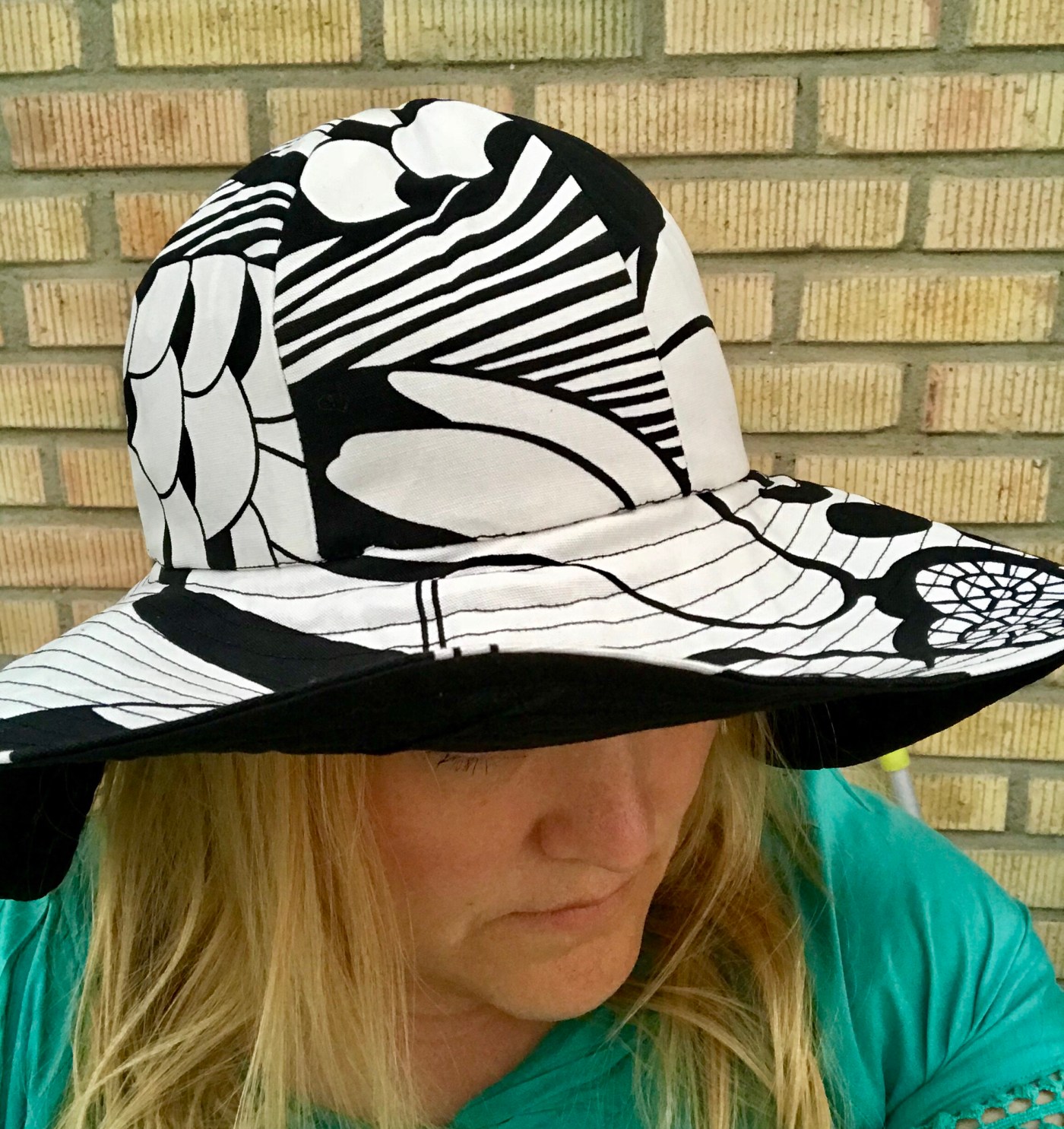 Det har verkligen varit en helt fantastisk sommar hittills. Det brukar vara något av en nitlott att få tidig semester som jag har i år, men det har varit oväntat varmt!När jag och min man åkte på en liten semestertripp körde vi nedcabbat. Trevligt, men jag lyckades faktiskt bränna hårbotten i den stekande solen. Jag tänkte att jag måste testa sy en solhatt att ha när jag är ute och påtar i trädgården.Jag hade inget mönster så jag försökte konstruera ett eget. Vi råkade ha en färghink med exakt samma omkrets som mitt huvud – den fick utgöra grunden för brättet. Till de sex kilarna som sätts ihop till kullen utgick jag från mitt strykjärn. 🙂