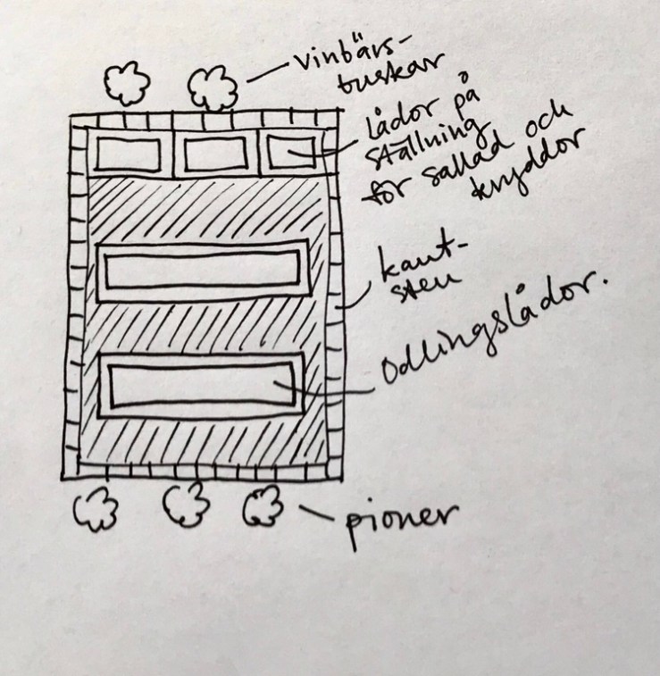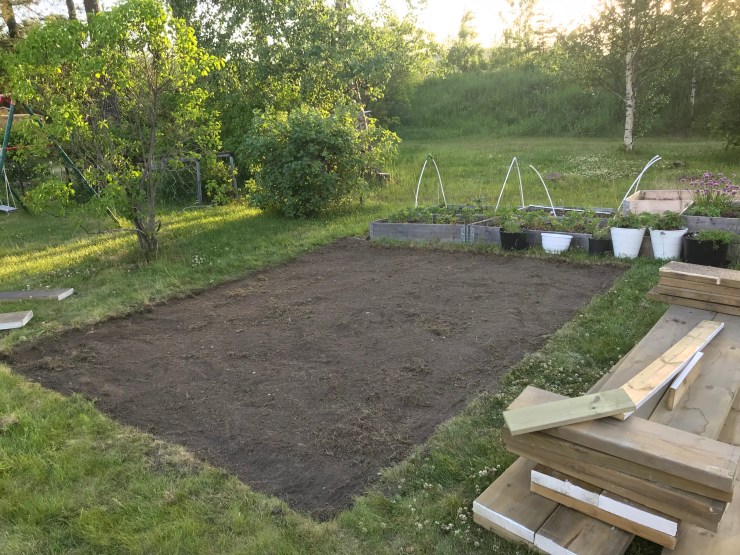Sedan är planen att bygga upphöjda odlingsbäddar för att det ska vara bekvämare att så och skörda. Dessutom använder grannskapets katter mina nuvarande lådor som kattlådor och krafsar bort det jag sått så jag ska också bygga högre ställningar till stora plastlådor som jag tänkte odla plocksallat och kryddor i. Förhoppningsvis kattfria.