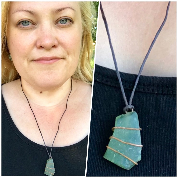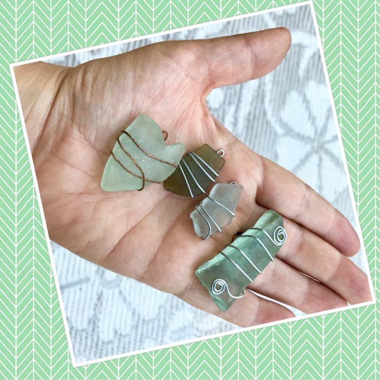 Nu letade jag fram min hög med diverse strandfynd för att göra smycken. Eftersom jag inte testat förut använde jag bara vanlig ståltråd att vira runt glasbitarna. Det hade varit fint att borra hål, men har inte vågat mig på att prova. Här några färdiga örhängen och hängen till halsband.