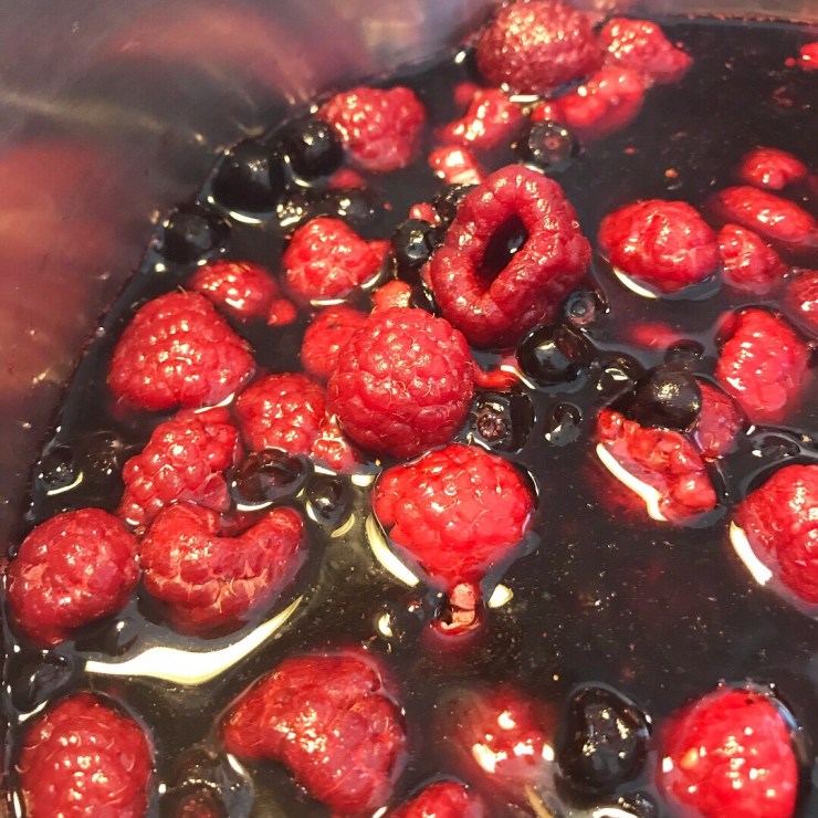 Koka upp 2 dl hallon, 2 dl blåbär, 3 dl vatten och 3/4 dl strösocker. Låt koka fem minuter. Dra kastrull åt sidan. Blanda 2 msk potatismjöl med lite vatten och vispa ner bland bären. Koka upp. Häll i fyra portionsskålar. Låt svalna. Strö över kanel. Ät med kall lättmjölk (receptet är med 3 dl på fyra portioner).