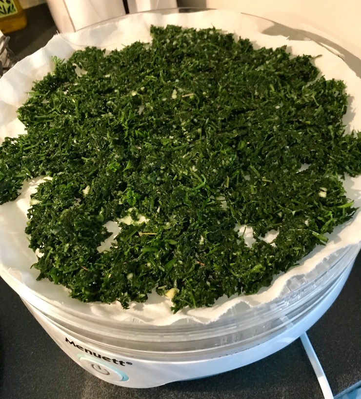 En av få saker som växer i min trädgård i år är persiljan. Jag bestämde mig för att testa göra en persiljekrydda som mamma brukar göra och blanda i kalla såser, ha på rostad potatis med mera.Fyll en matberedare med persilja. Lägg i två vitlöksklyftor och 1-2 matskedar salt. Mixa.Torka persiljemassan. Använder du tork som jag gör på bilden bör man klippa till en bit tyg att lägga blandningen på så att den inte trillar genom hålen.
