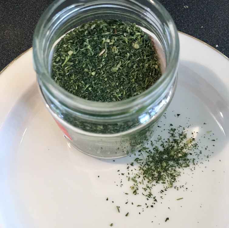 När persiljan är torr mixas den till ett pulver. Jag använde mortel och det funkade också bra!