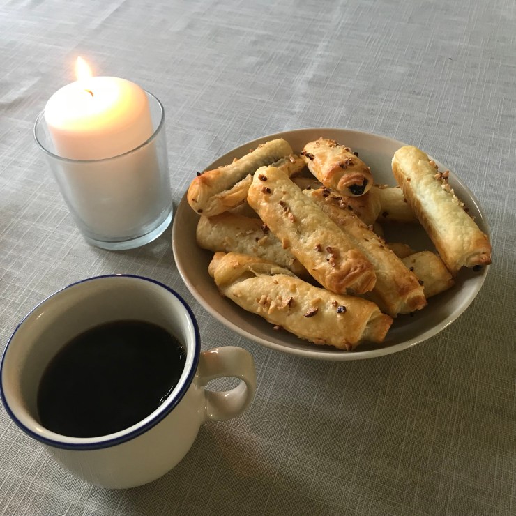Jag fick något slags hjärnsläpp när jag skar upp den köpta smördegen – bitarna blev för små! Jag la en klick sockerfri hasselnötskräm i och rullade ihop till små rullar istället, och märkte sedan att jag inte hade några ägg att pensla med. Ja, det blev kanske inte världens mest lyckade bak, men de gick att äta! 😋