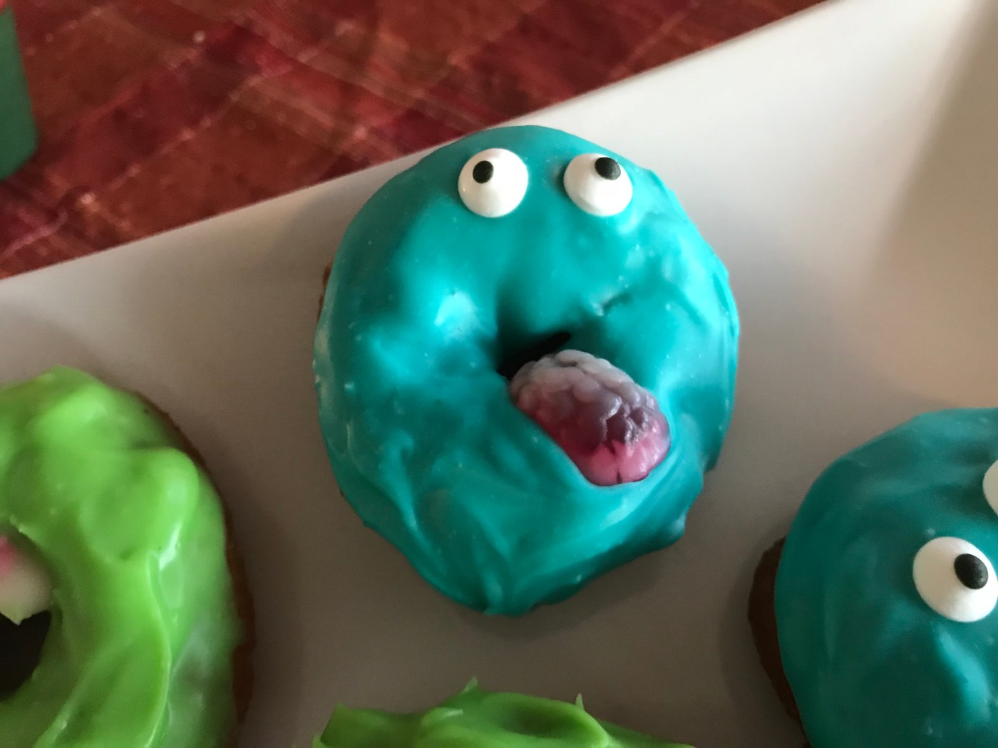 Vi gjorde en enkel frosting: Runt 50 gram smält vit choklad, en matsked färskost och lite färg. Vi gjorde både en blå och grön. Blanda och bred på munkarna.