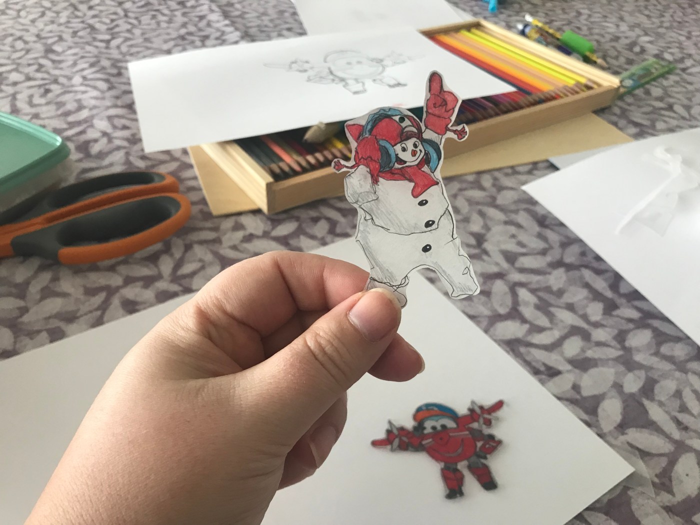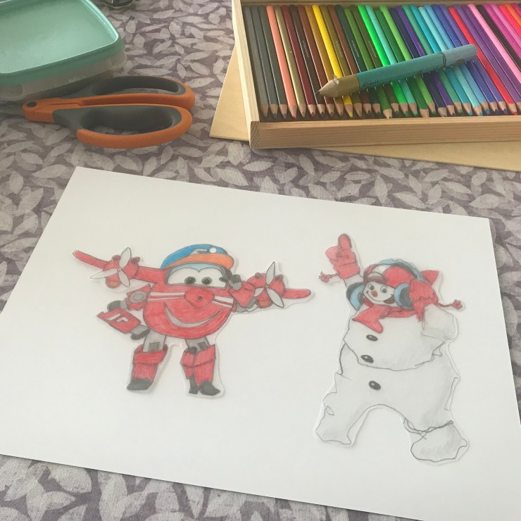 Kul att rita på fri hand. Men lätt att rita av motiv också eftersom plasten är genomskinlig. Vi målade med blyerts och kritpennor också. Här är Flip från Mästerflygarna och Vemdalens egen gosiga maskot Valle.