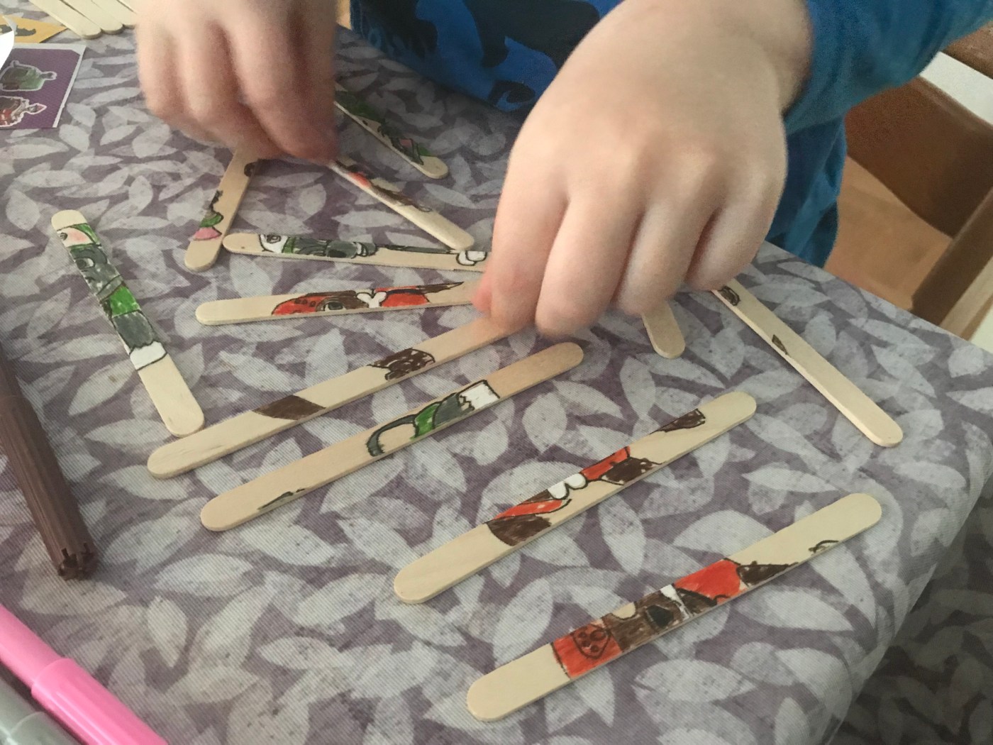 Det är lätt som en plätt. Tejpa ihop några glasspinnar och rita något på andra sidan. John ville ha Paw patrol. Så jag ritade Zuma och Rocky med vanlig blyertspenna. När jag var nöjd ritade jag konturerna med en svart penna och suddade bort blyertsen. Sen fick John färglägga med sina tuschpennor.