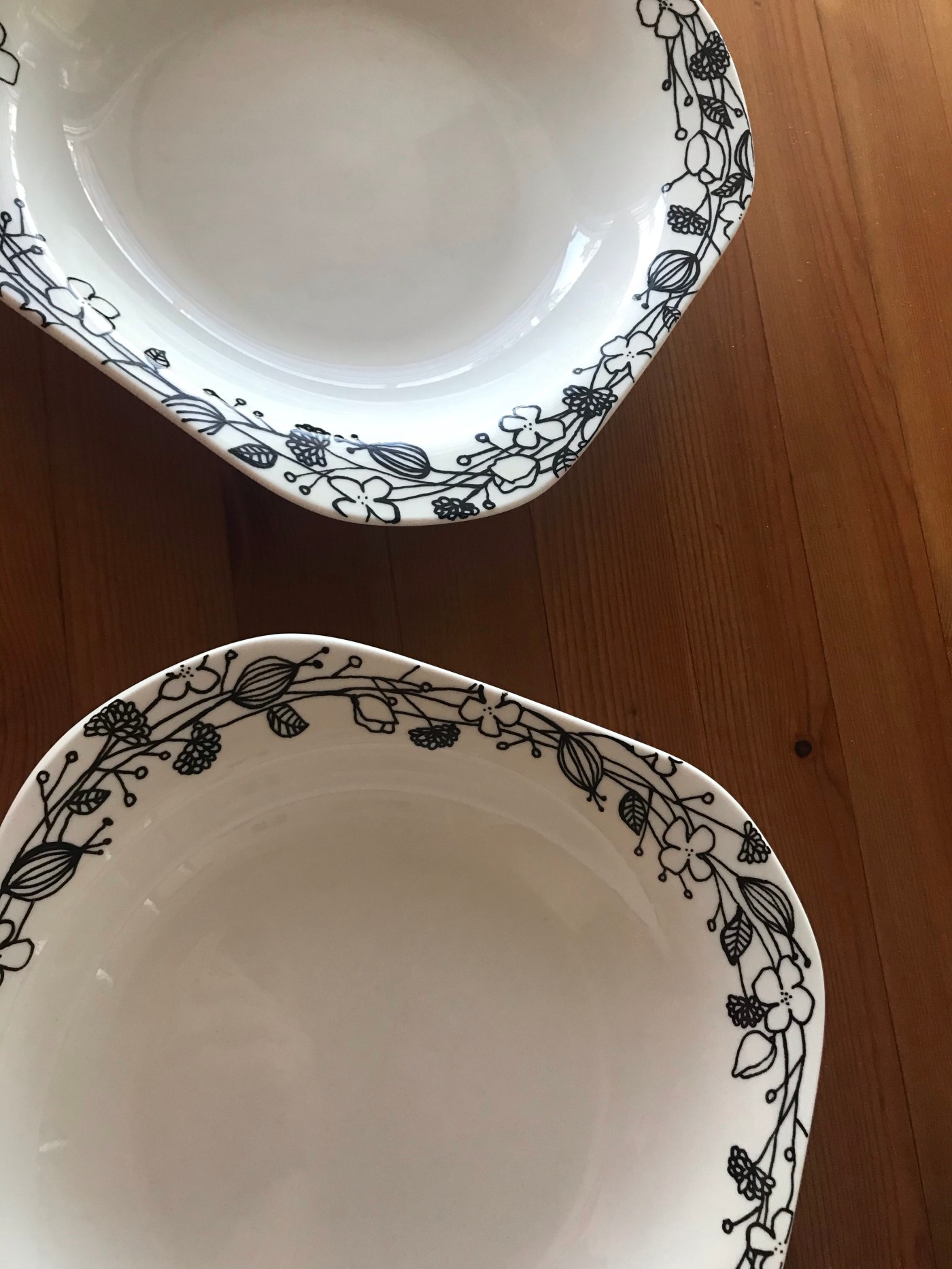 Den här djupa tallriken köpte jag på Erikshjälpen i Timrå. Den var alltså helt vit innan jag tog fram porslinspennan från Panduro. Det fick bli en kant av blommor. Det var lite annorlunda att måla på slitet porslin. Den är inte lika slät och ojämnheterna märks när man målar. Men eftersom man inte ska rita på ytan där maten är så funkar det rätt bra, kanterna är inte lika slitna. Tänk också på att med begagnat porslin det blir ännu viktigare att rengöra för att få bort alla fettfläckar.