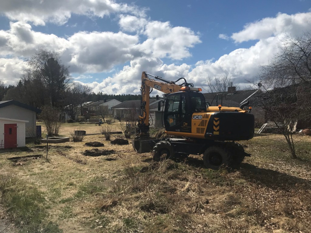 Och i dag får jag inledningen av min present också. Helt plötsligt stod två grävare ute och ville jämna till vår så kallade trädgård! Så skönt! Precis vad jag önskade mig i 40-årspresent.