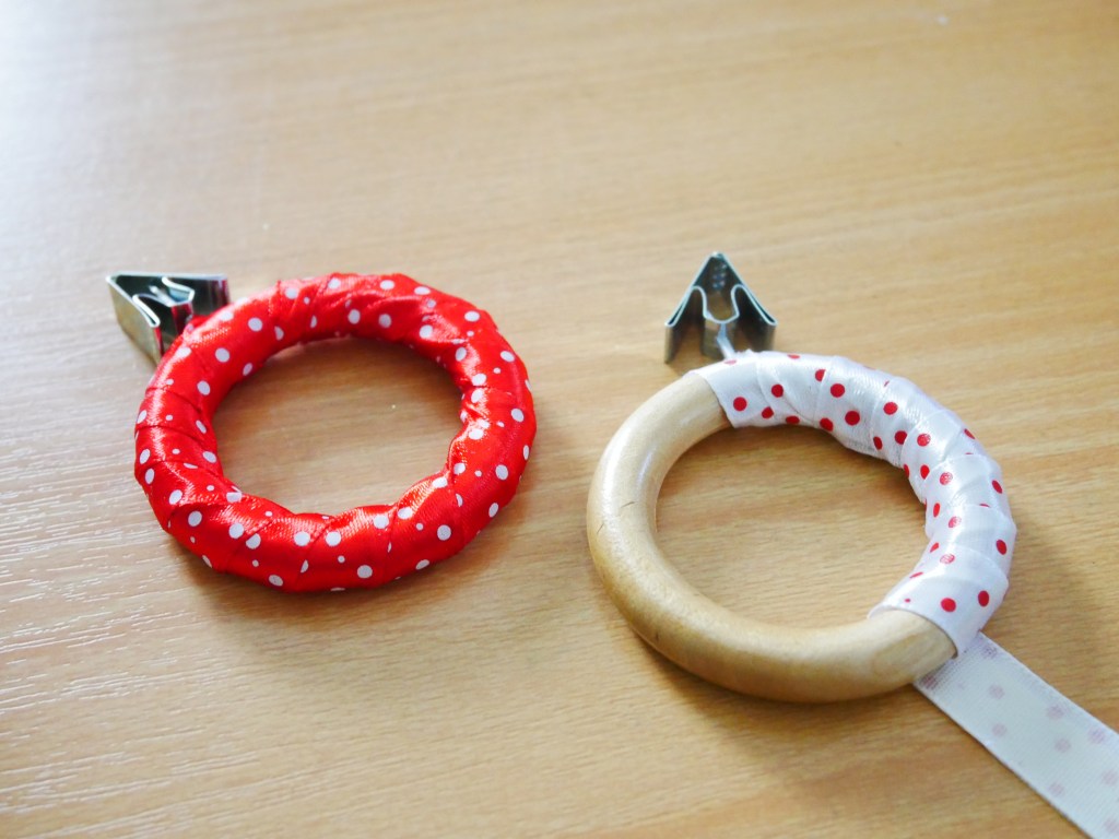 Gardinringar. Jag har massa sådana i olika storlekar. Jag satt och kollade på samlingen en dag och tänkte, de här borde jag kunna pyssla av. Det fick bli julgranspynt! Om du inte är som jag och sparar så finns det ofta gardinringar att hitta hur billigt som helst på loppis.