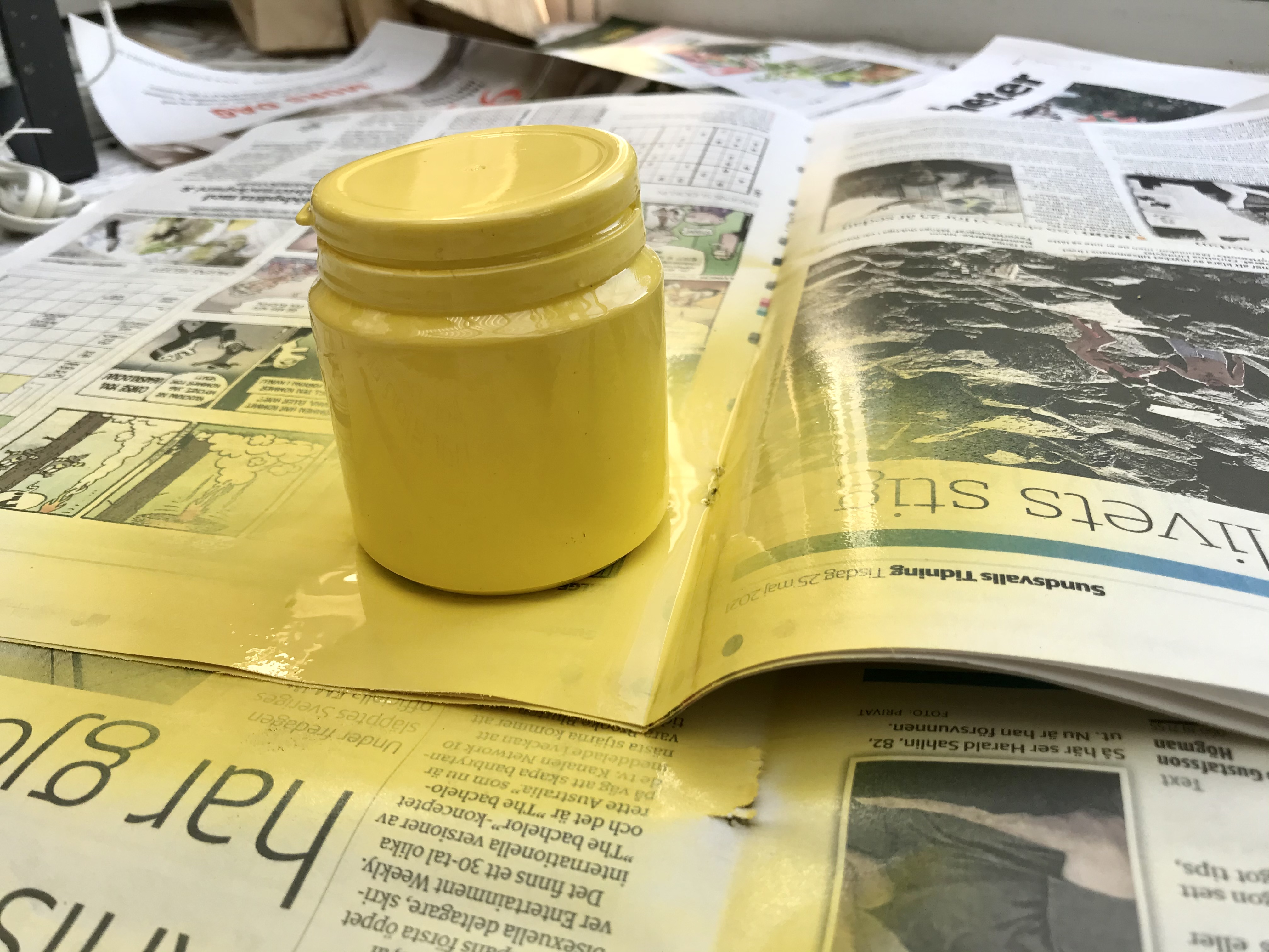 Jag letade fram gul sprayfärg som jag hade hemma och satte igång. När färgen torkat ritade jag ett ansikte med svart permanent penna.