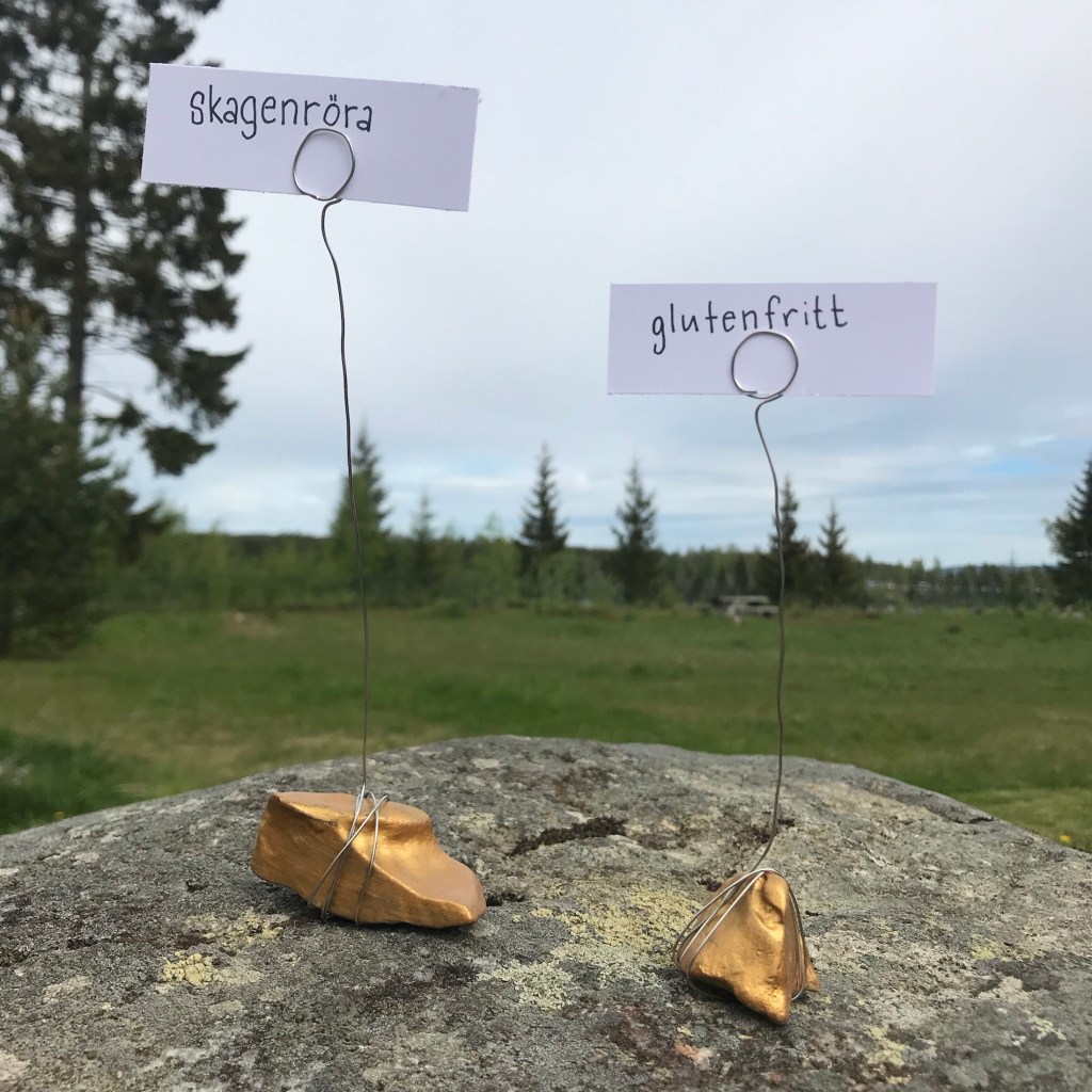 Jag gjorde skylthållare både till bordsplacering och till buffébordet. Du behöver: Stenar, ståltråd, tång, eventuellt pärlor och hobbyfärg. Vissa tråkigare stenar målade jag med guldfärg.