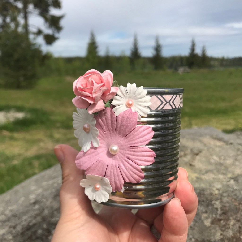 🌸 Sen pyntade jag en konservburk med washitejp och pappersblommor. Tänker att man kan ställa skedar i den kanske.