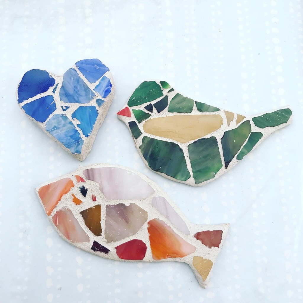 Jag klädde också in ett hjärta och en svamp som jag gjöt i betong under förra sommaren. Här var tanken att det skulle se ut som en flugsvamp, men jag hade för få bitar… De oregelbundna glasmosaikbitarna köpte jag förresten på Adlibris, de har ju en hel del pysselsaker utöver böckerna. De bitar jag tyckte var finast har jag borrat hål i, med tanken att göra smycken.