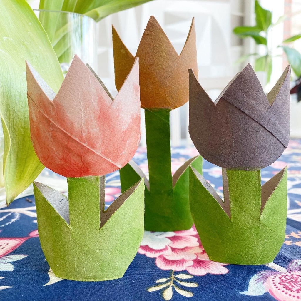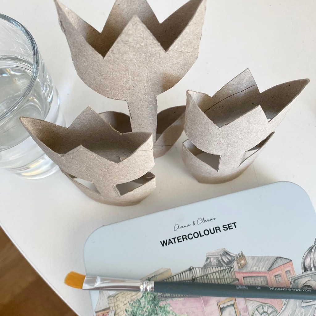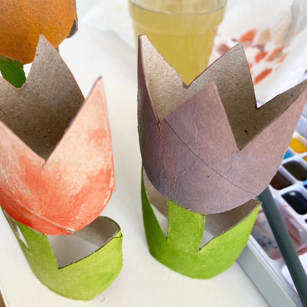 Här är ett enkelt pyssel som jag gjorde i dag. Tulpaner av toarullar, och en hushållspappersrulle. Ett pyssel som passar barn. Mindre barn kan ju behöva hjälp att klippa, men alla kan måla.