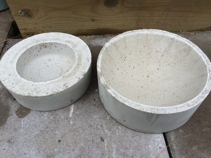 Jag har för första gången testat gjuta i betong. Det var lättare än jag hade trott att både blanda betongen och lossa formarna. Däremot blev det rätt mycket hål i det jag gjort så jag måste försöka få bort fler luftbubblor nästa gång. Till vänster en ljuslykta och vas, till höger en platta och…