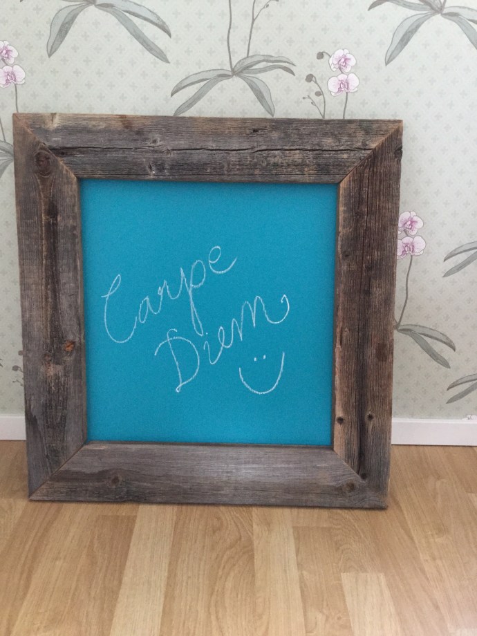 Jag köpte färg på Panduro, ni vet sådan där ”svart tavla”-färg som man kan skriva med kritor på. De hade olika färger, men jag köpte turkos, målade på en bit board som vi hade hemma och spikade upp den i en stor träram som jag köpte på loppis för många år sedan. Så här blev…