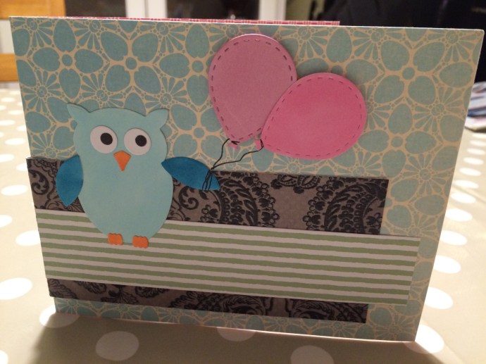 Även syster Sara har fyllt år. Hon fick ett ugglekort. Ugglan stansade jag ut av vitt papper. Även ballongerna. Sedan målade jag dem med mina promarkerpennor… …så att de skulle matcha pappret. Så här blev kortet: På insidan ritade jag en blomma. Har börjat rita allt mer själv i stället för…