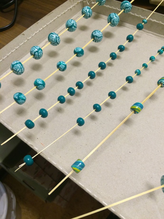 Just nu har jag fastnat för Fimolera! Det är kul att göra pärlor, men det tar hela kvällen när man väl satt igång. Så här blev det första försöket. Nu har det blivit pärlor till två nya halsband. Det blev ett blått… … och ett svart. Jag testade att delvis använda den…