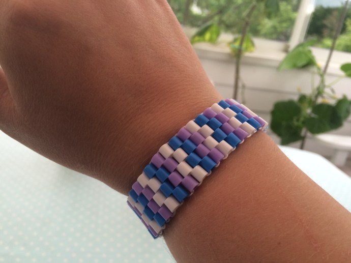 Jag hittade en beskrivning på hur man kan göra armband av vanliga pärlplatte-pärlor på nätet. Jag testade först med den vanliga sortens pärlor. Det är bra att använda elastiskt band, så behöver man inget lås. Det gick rätt snabbt och enkelt att göra. Sedan provade jag med mindre pärlor av samma typ. Det…