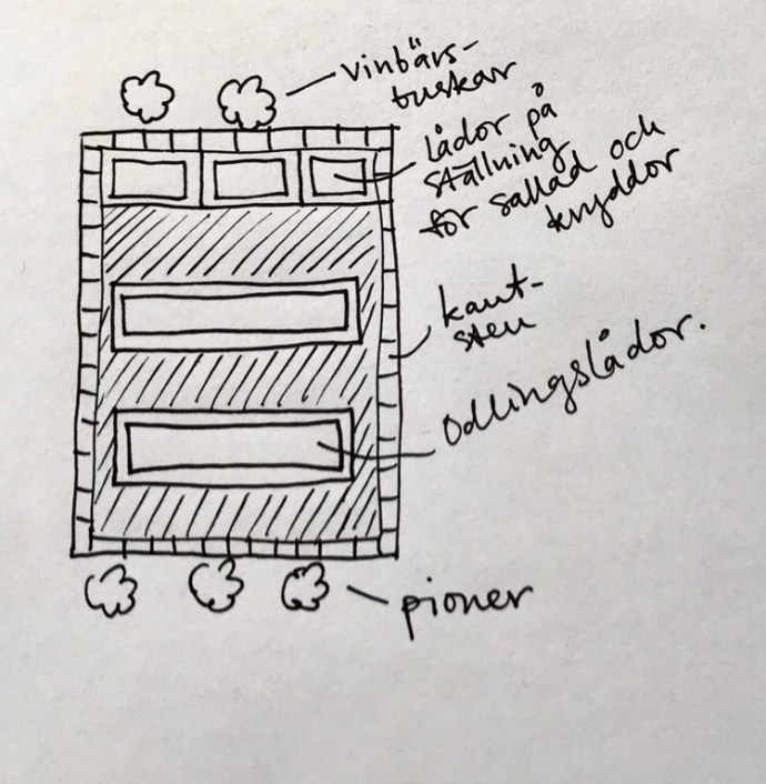 Jag skrev tidigare om mina planer för odlingslådorna. Nu har det gått framåt! Markduk och grus är lagt och odlingslådorna byggda! Jag har använt restbitar i mitt bygge, med tidigare skruvhål och lite färg här och där på brädbitarna, men det ger bara patina …säger vi. 🙂I de höga ställningarna har jag Ikea-lådor av plast…