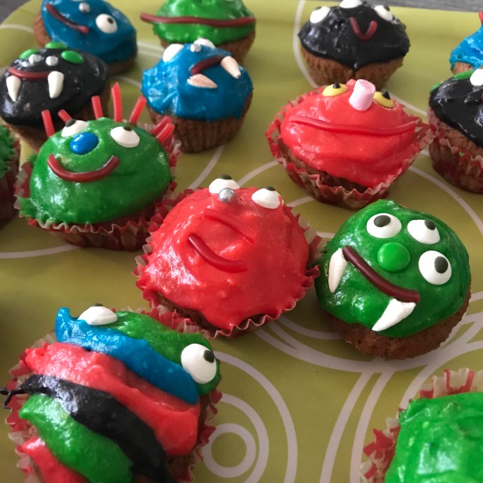 I år tänkte vi inte ha någon läskig spökfest till halloween. Däremot bjuda vänner på lite monsterfika. Jag och sonen sökte på ”halloween” och ”bakelser” på Pinterest för att inspiration. Finns så mycket fint, roligt, knasigt och alldeles för läskigt. Det fick inte vara nåt med blod, bestämde vi. Hellre söta monster. Vi gjorde först…