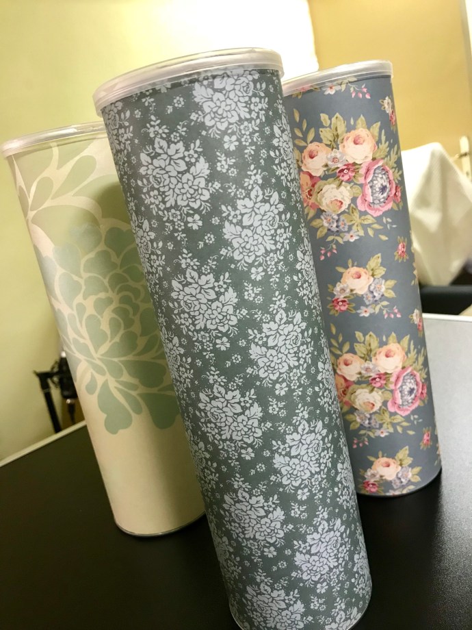Tomma Pringles-rör blir fin förvaring med lite papper och tapetrester! Röret längst till vänster klädde jag in i en liten restbit av en favorittapet som jag hade i en tidigare lägenhet – Isodore, Laura Ashley. /Sara.