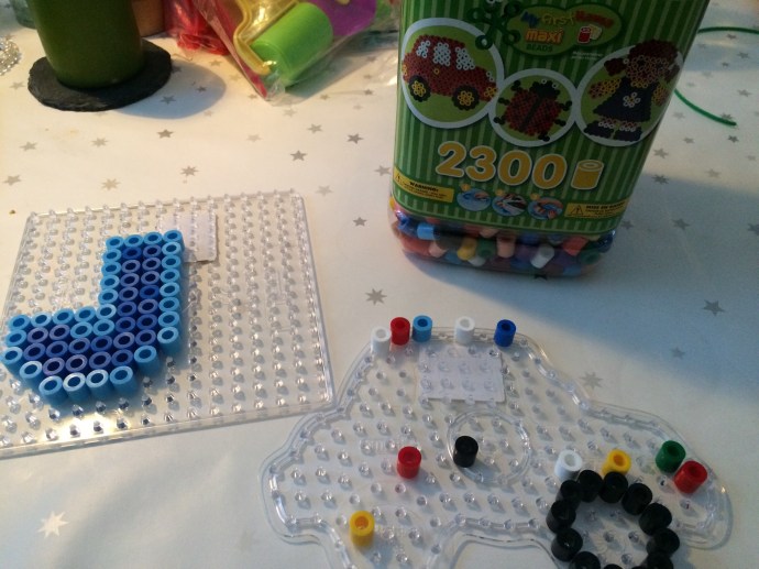John fyller 3 år i maj. Så nu kände jag att det var dags att testa pärlplattor. Köpte en stor burk med stora pärlor. Jag gjorde ett J. John påbörjade en bil. Så här långt kom han innan han lessnade. 😂 Och då gjorde jag däcket. Så kanske är han för ung. Eller…