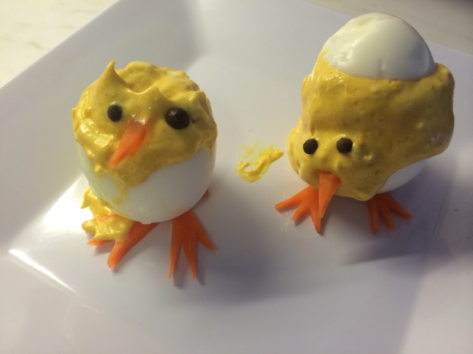Såg så söta äggkycklingar delas via Facebook, var tvungen att testa. Koka äggen hårda. Skär till fötter och näbb… … av morot. Tyvärr hade jag lite bråttom och majonnäsen var rinnig. Sen ramlade den ena kycklingen över den andra. Men söta ändå. 😅 Ögonen är kryddpepparkorn. Majonnäsen färgade jag gul. Glad pysselpåsk! /Elina…